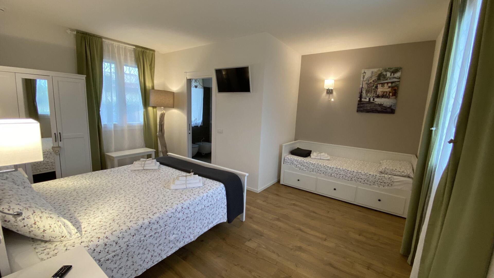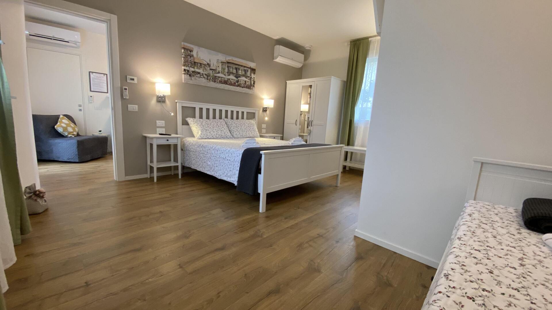 Camera da letto con bagno privato con un letto matrimoniale Queen size, 1 divano letto da cui si ricavano 2 posti letto, nella zona giorno una poltrona che all'occorrenza si trasforma in un quinto letto.