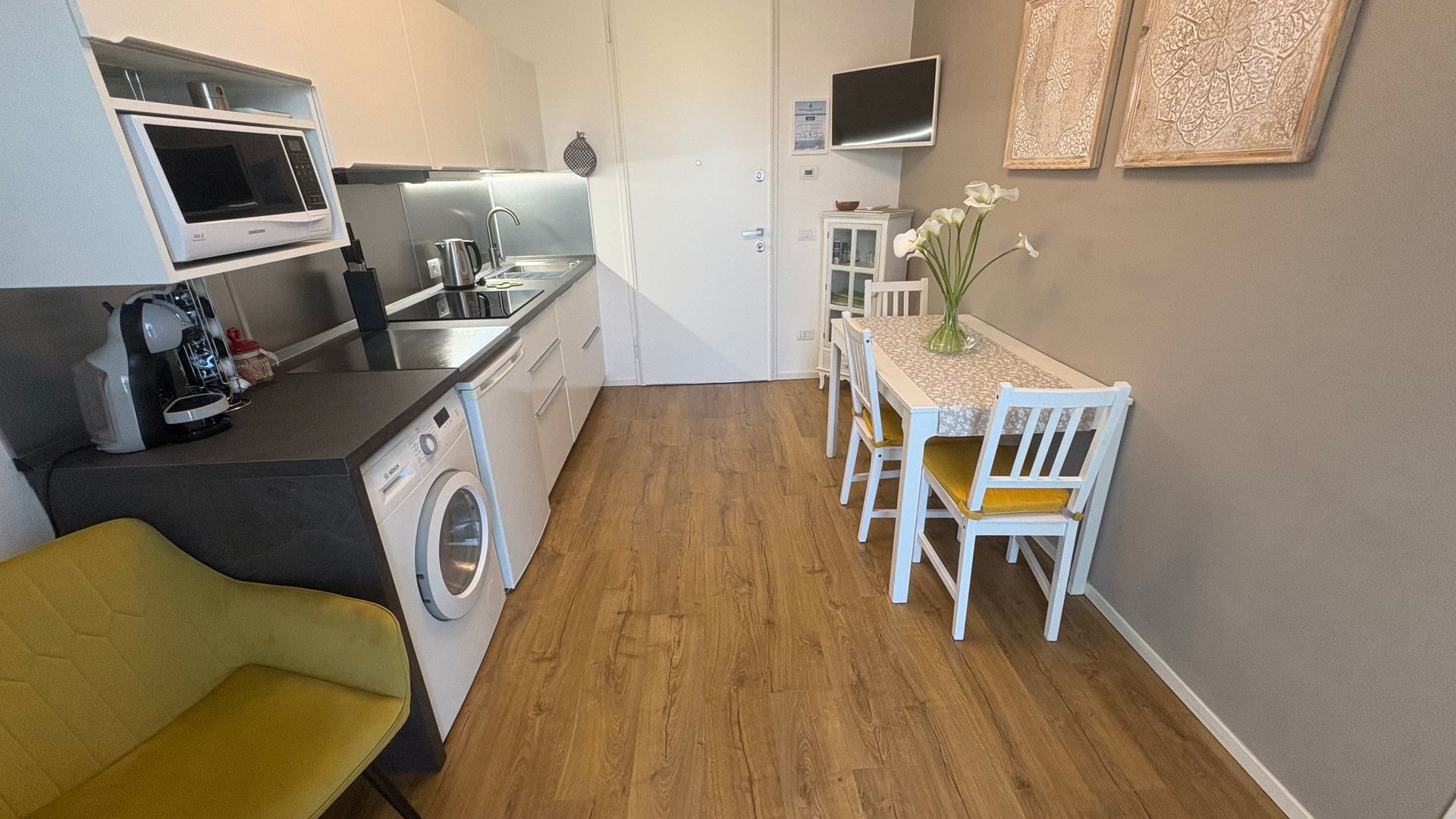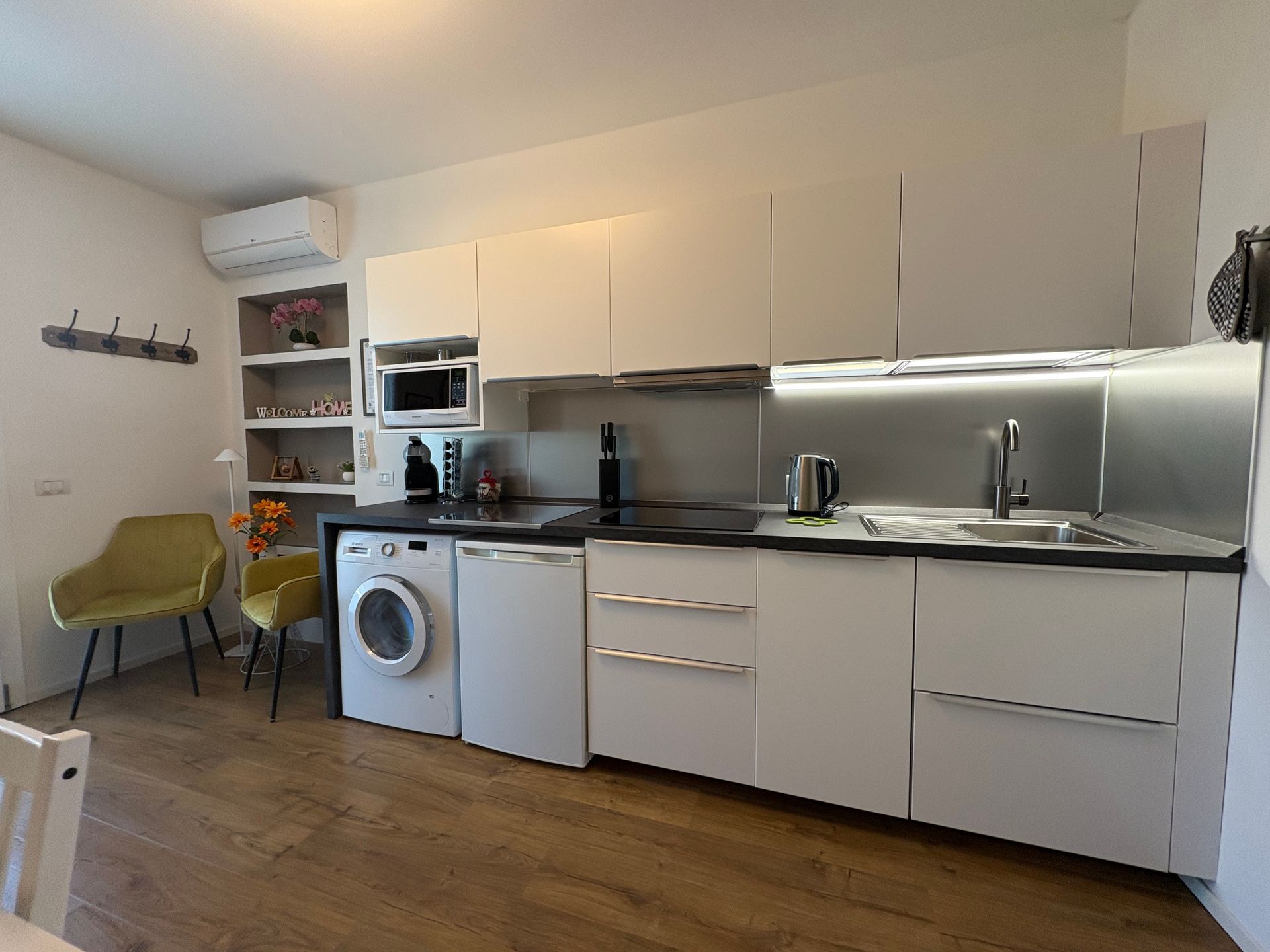 Equipped kitchen with induction hob, sink, fridge, dishwasher, microwave, kettle, coffee machine, moka, toaster and washing machine.