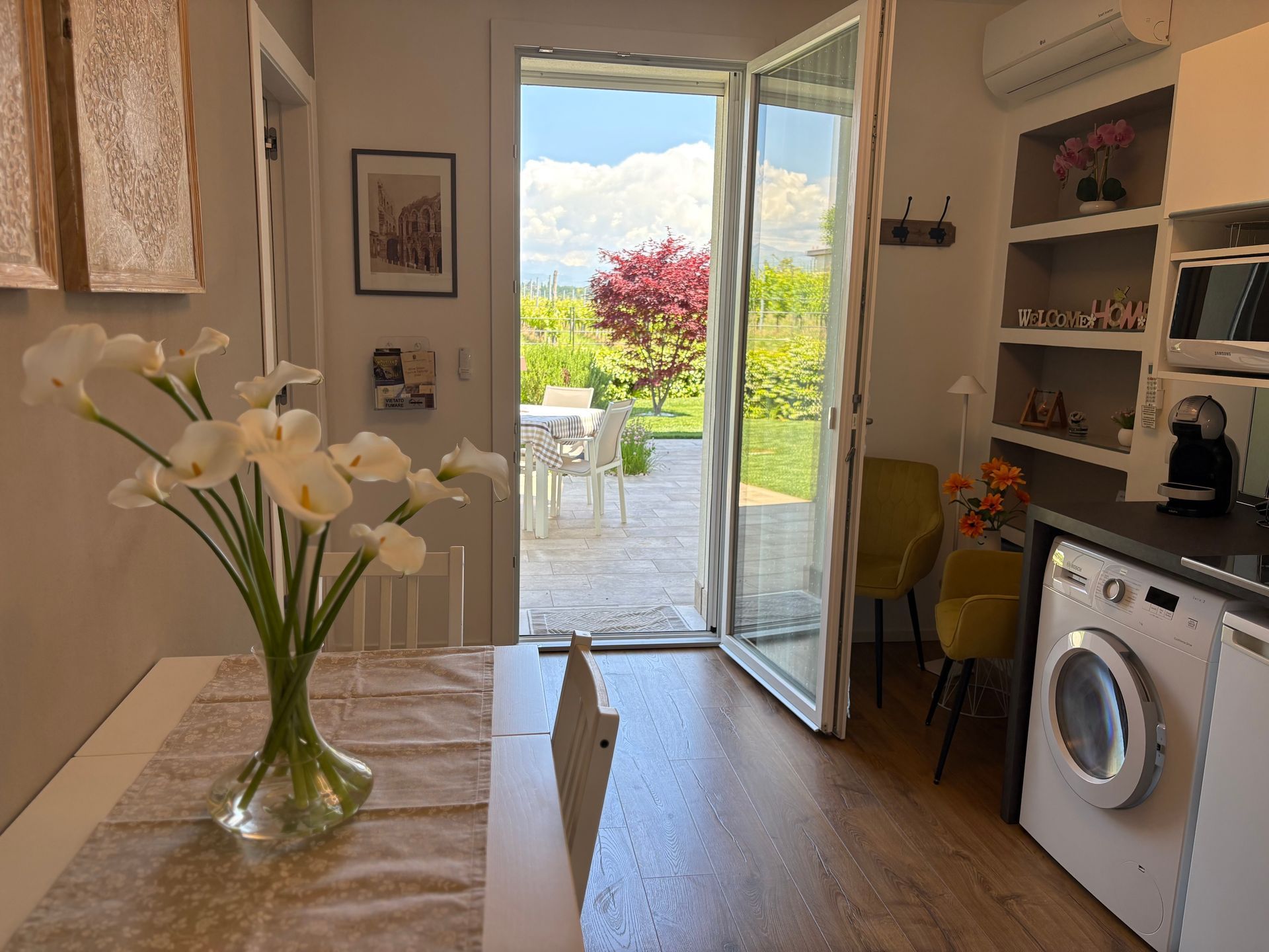 Located just 1 km from the Zoo Safari Park Natura Viva, in the locality of Sandra, our apartment obtained from a brand new detached villa completed this year, is surrounded by greenery in front of a beautiful vineyard, where you can relax and be close to all the attractions that Lake Garda offers.